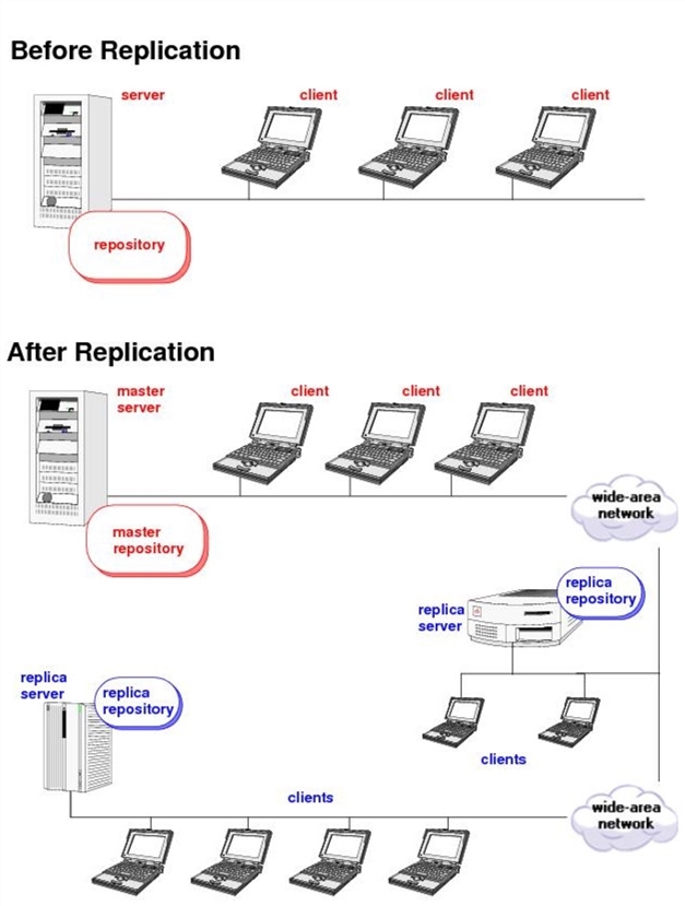 By contrast, a replica repository can become out of date during day-to-day usage: it can be missing recent transactions initiated by clients using other replica servers or the master server. You can issue a simple synchronization command to download such missing transactions from the master repository to the replica repository. This makes the replica repository database into an exact copy (temporarily, at least) of the master repository database. Synchronization also occurs automatically whenever a transaction is initiated by a client using that replica server.