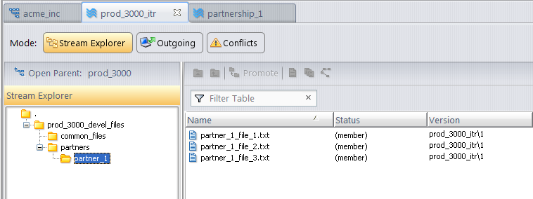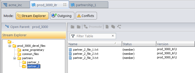 When you (acme_1, who has full access to all elements) view the contents of the prod_3000_itr stream, all folders and elements are visible. In the following example, the elements in partner_2 are displayed.