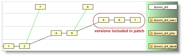 Derek decides to patch version brown_dvt_mary/7 into his workspace. AccuRev searches backward through the element’s ancestry, and includes the set of changes recently made in Mary’s workspace: this set includes brown_dvt_mary/5 through brown_dvt_mary/7; the patch doesn’t include the two versions created in workspace brown_dvt_john.