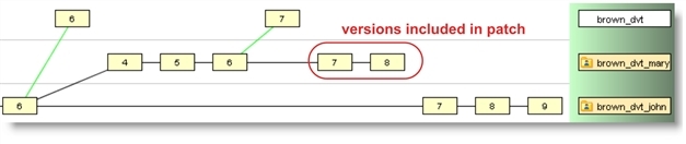 In this command, version 4/8 (brown_dvt_mary/8) was patched into version 5/9 (brown_dvt_john/9), and the result was kept as version 5/10 (brown_dvt_john/10). The backward search through the file’s ancestry identified 4/6 (brown_dvt_mary/6) as the basis version.