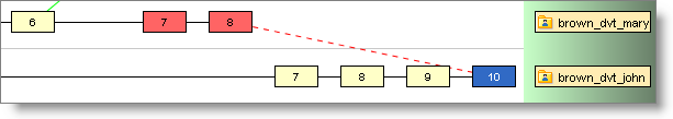 Example 2: Suppose Mary started by bringing version brown_dvt_john/6 into her workspace with an update. Then she created versions brown_dvt_mary/4 through brown_dvt_mary/6, promoted her work to the backing stream, and created two more versions: brown_dvt_mary/7 and brown_dvt_mary/8.