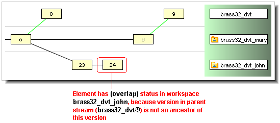 Version W, in a workspace or stream, has (overlap) status if version P in the parent stream is not an ancestor of version W.