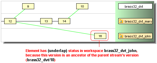 The example below illustrates a common (underlap) scenario: john brings an old version, brass32_dvt_mary/12, of the element into his workspace, using the co (GUI: Send to Workspace) command; this old version is an ancestor of the version currently in the backing stream of john’s workspace.