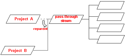 Reparenting all four programmers’ personal streams from the Project-A stream to the Project-B stream requires four separate operations. But suppose the programmers’ streams were all children of the same pass-through stream; moving the team to a different project requires just a single operation: reparenting the pass-through stream.