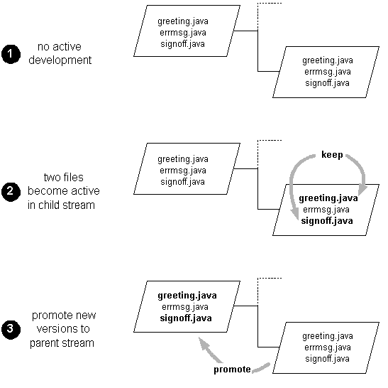 In a multiple-level stream hierarchy, several promotions are required to propagate a set of changes all the way to the top level. Each promotion causes the file(s) to become active in the “to” stream, and inactive in the “from” stream.