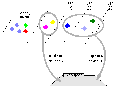 As new versions enter a stream, they become available to the sub-tree of streams and workspaces under that stream. But AccuRev never copies a new version of a file into your workspace automatically. Instead, you periodically use AccuRev commands to update the workspace. This replaces existing files (or adds new ones), so that the files in the workspace accurately reflect the stream’s versions and path elements, including any recently-arrived versions. AccuRev takes care not to overwrite files that you’re working on when it copies new versions to the workspace.