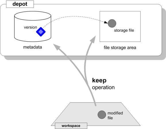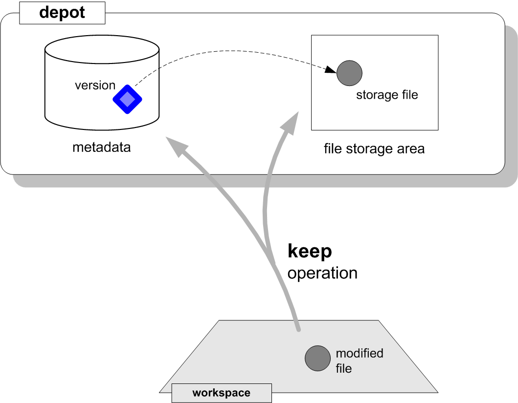 Every so often, the developer tells AccuRev to save the current contents of a file (or a group of files) to the depot’s repository. This operation, called a keep, does two things: