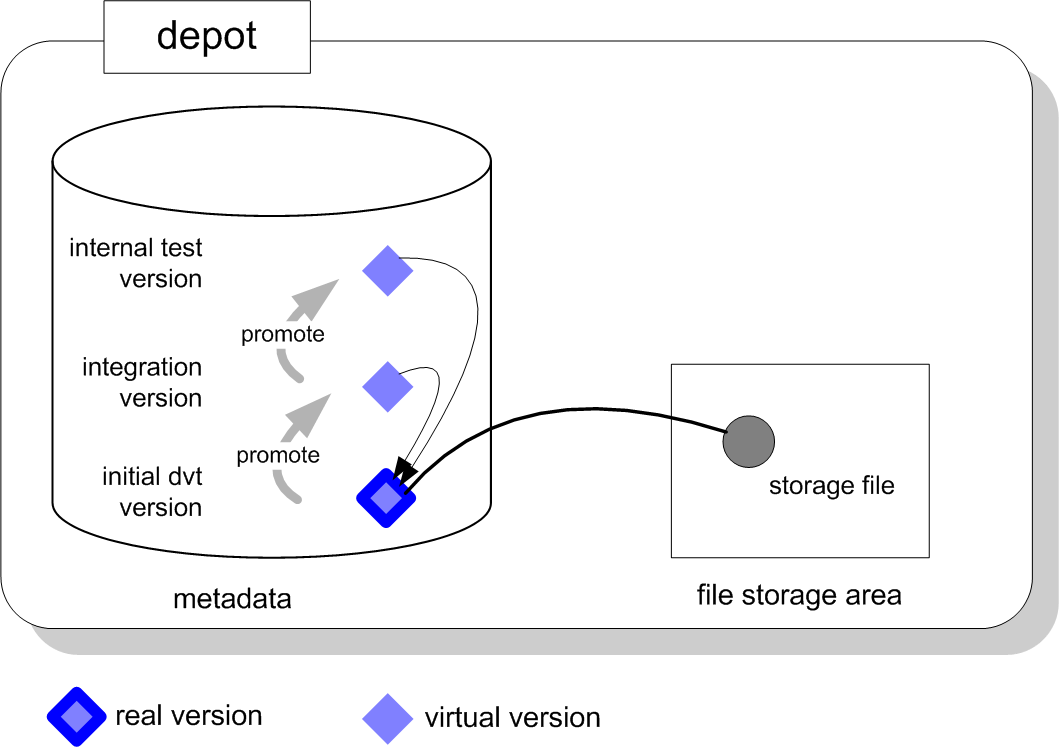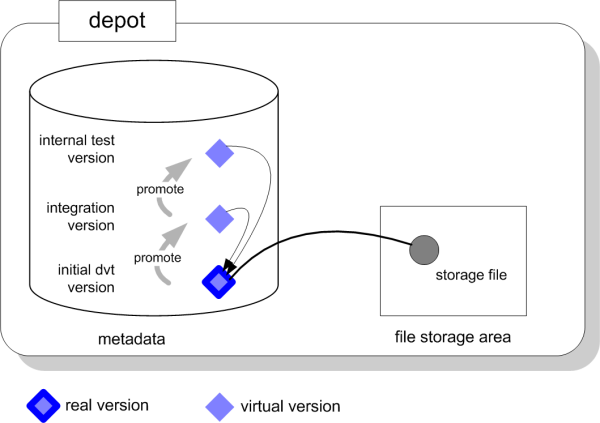 - A virtual version is created by a promote. It creates a new version object in the metadata stored for the depot, which provides an additional reference to an existing file in the file storage area. Conversely, a demote operation removes a virtual version.