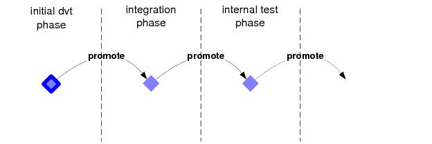 Software development is much more than just creating and modifying files. A typical development project involves many phases, possibly including initial development, integration of work done independently, internal system testing, external testing, and final production. AccuRev uses a “promotion model” to manage files in these multiple development phases. Files progress through the phases, one by one: when a set of files pass the tests (if any) mandated for a particular phase, a user working on that phase promotes them to the next phase.