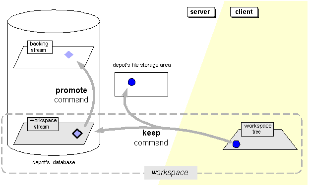 - The promote command propagates the version from the workspace stream to the backing stream. This command operates totally within the metadata stored for the depot. No files are copied to the file storage area during a promote.