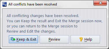 ) buttons to resolve the current conflict by choosing changes from one of the versions. You finish the Merge by preserving the merged file, selecting Keep & Exit when all the conflicts have been resolved.
