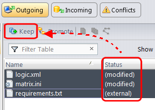 This figure shows how to invoke the Keep command from the File Browser toolbar. Keep is also available from the Actions and context (right-click) menus. You can also keep new files, like requirements.txt in the preceding illustration, its status is external because it has not yet been added to AccuRev.