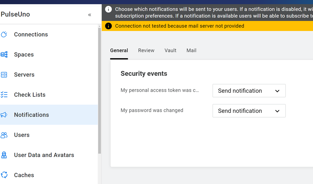 PulseUno uses email notifications to inform users of changes in code reviews that they are involved in. The PulseUno administrator must first configure SMTP email settings for the system and then configure what notifications are enabled for the organization. Then individual users can configure what notifications they want to receive.
