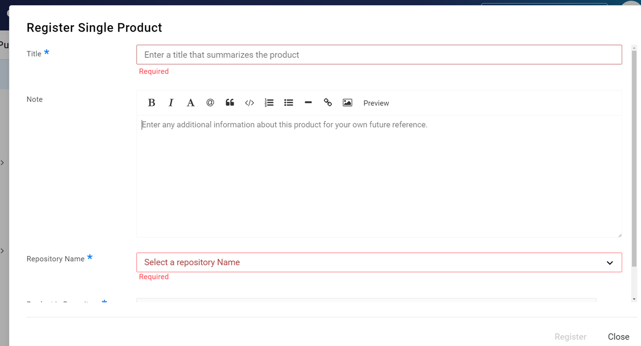 2. Next, Register a Product for each AccuRev depot that will perform code reviews. You can register a Single Product (depot) at a time, or you can bulk-select depots and register Multiple Products):