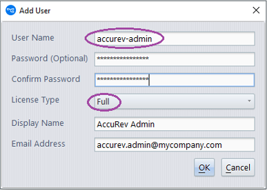 In the AccuRev GUI, under Admin | Security, add a new user called "accurev-admin". Be sure to assign a full license to this user.