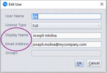 3. Start (or restart) the AccuRev GUI and open the list of users (located under Admin | Security). Edit all the users and ensure that each has a Display Name and Email Address: