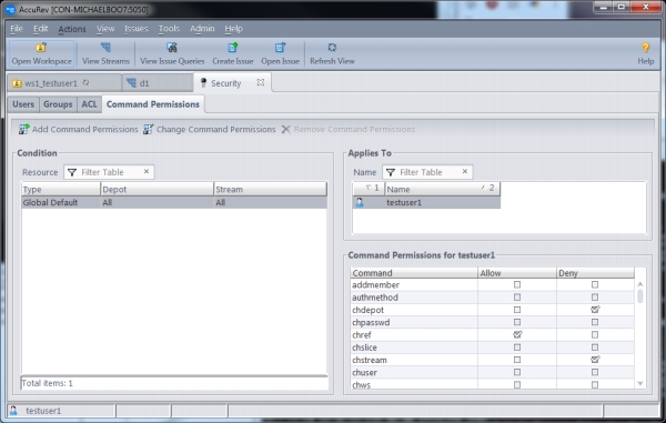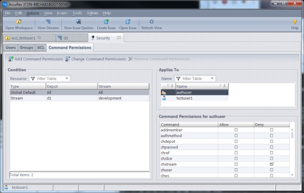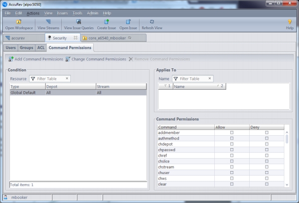 A new graphical user interface has been implemented to enable the AccuRev administrator to configure which users are allowed to execute a variety of administrative level commands. Previously, the way to do this was to write perl script in the server_admin_trig.bat or server_admin_trig.pl files installed in the <ac-install>/storage/site_slice/triggers directory.
