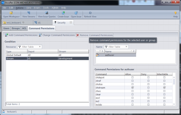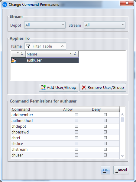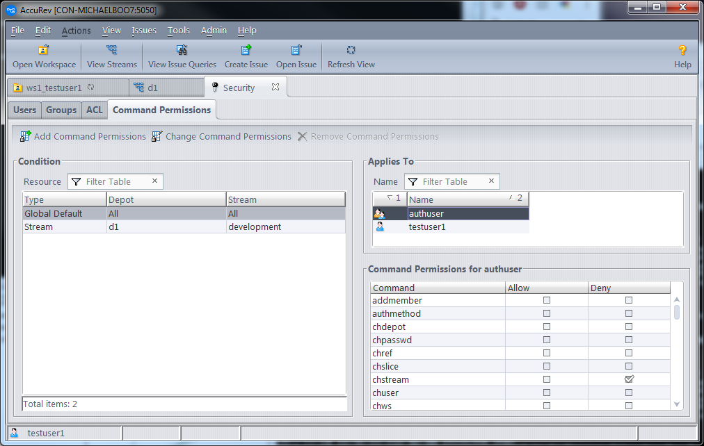 In the case that permissions have been configured for both a user directly and a group that the user is a member of, the permission setting closest to the user is the one that applies. For example, if a user is a member of the “qa” group and the “qa” group is denied access to the “chstream” command, but the user is specifically configured to be allowed permission to the “chstream” command, the user’s own permission is the one that applies.
