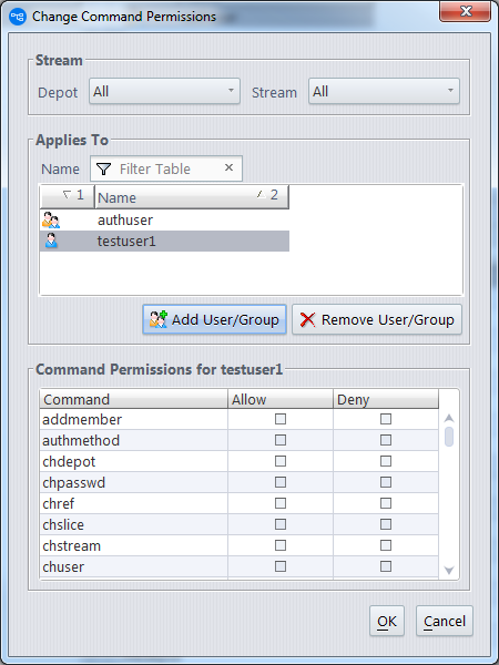 If you add testuser1 to the Applies To section, you can see that the command permissions for “testuser1” can also be configured now. Once you configure permissions for the desired set of users and groups, click OK to save your changes.