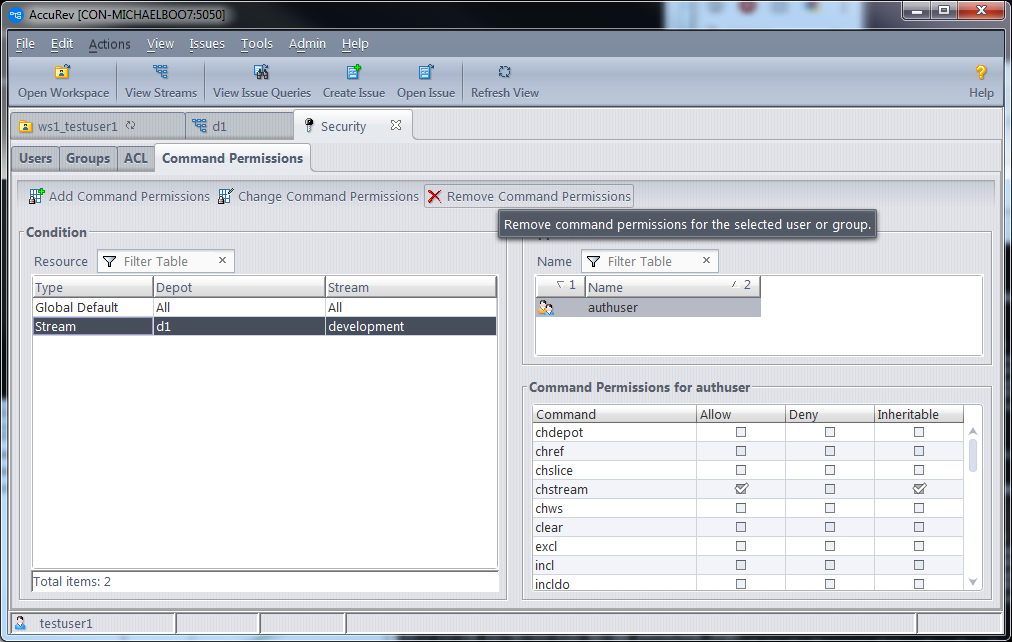 To remove a condition entirely (except for the Global Default Condition), highlight the condition and click the “Remove Command Permissions” button. To remove command permissions for a specific user or group from a condition, highlight that condition and select “Change Command Permissions”. In the dialog that pops up, remove the users and groups that you no longer want permissions to be set for.