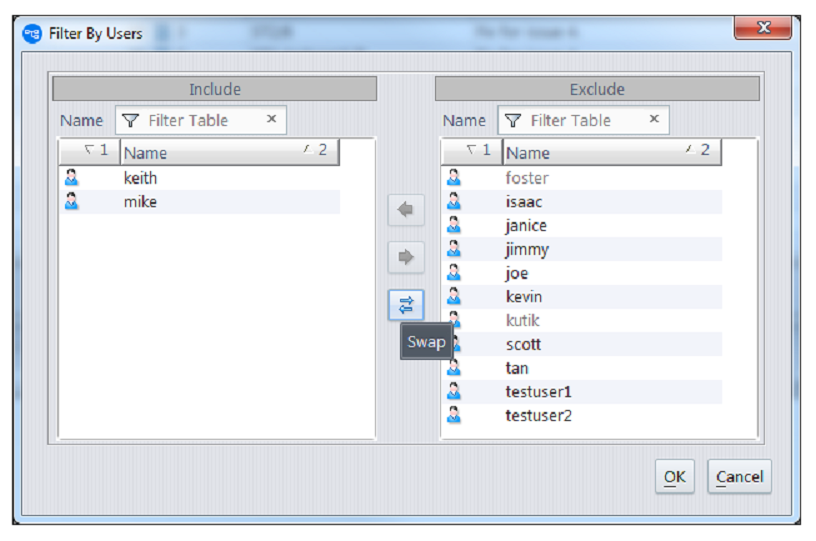 AccuRev groups are displayed at the bottom of the dropdown menu. You can select any one of the groups in order to see what transactions were executed by members of that group. If you choose “Select Users…” instead, a dialog will appear and allow you to divide the set of AccuRev users into an Included list (the users whose transactions will be displayed in the History Browser) and an Excluded list (the users whose transactions will be hidden from view). Left- and right-arrows move selected users from one table to the other, and the Swap button performs a quick exchange of the two tables’ contents.