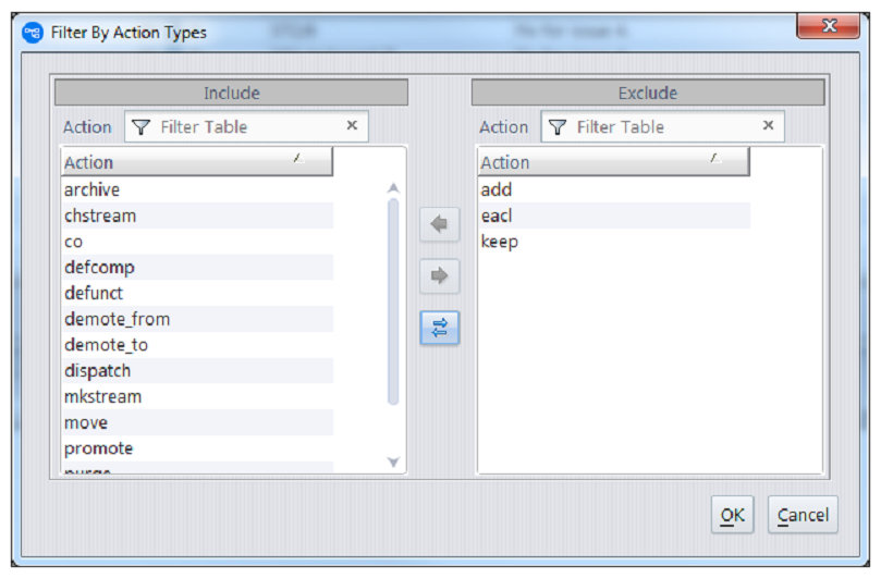 The new Actions filter in the History Browser allows you to select what types of actions you want to see listed in the transactions table. Again, you use the arrow buttons to divide the set of action types into an Included list and an Excluded list and then click on the OK button.