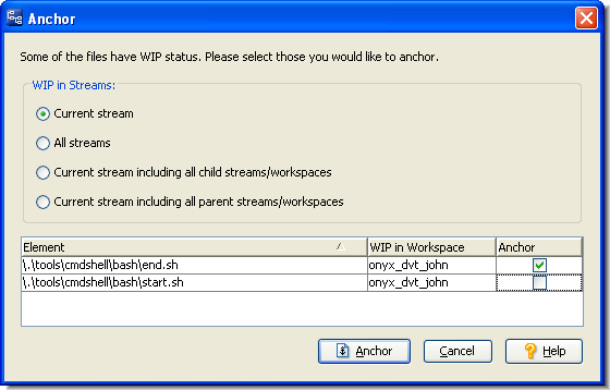 When you anchor a set of elements in an anchor-required workspace, a dialog appears if one or more of them is active in a sibling workspace. This enables you to select/deselect individual elements to be anchored. Note that the elements that are active in the sibling workspace are initially deselected. This makes it easy to avoid the situation where multiple users are working on the same file(s) concurrently. The exclusive file locking feature guarantees that this situation won't occur.