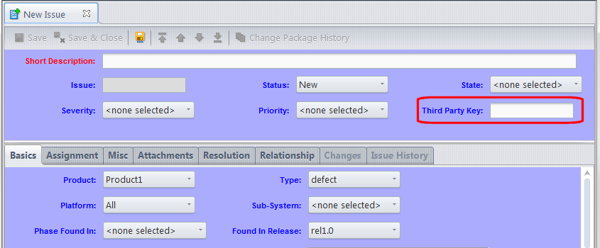 Note that some AccuRev schemas (like the schemas delivered with AccuSync) already have a third-party key defined, such as “jirakey”. If this is the third-party ITS key that you need to use, you just need to ensure that it is assigned to the 3pty ITS Key dropdown menu as described above, and that it is positioned on the Issue form as described below.
