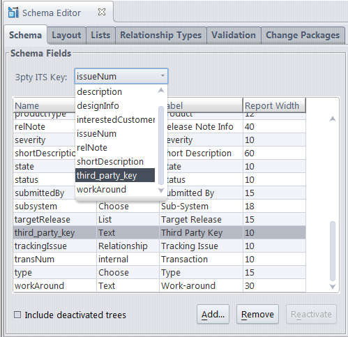 To make use of third-party ITS keys, you must first modify the AccuRev schema. You can do this by either manually editing the schema.xml file, or by using the Schema Editor in the AccuRev GUI (see the “Schema Editor” section of the AccuRev On-Line Help Guide).