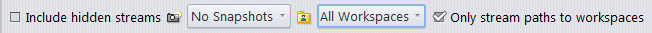 This drop-down list controls how many snapshots are visible in the StreamBrowser. It contains the choices No Snapshots (the default), All Snapshots, Past week, Past 2 weeks, and Past 4 weeks. (Check the Include hidden streams checkbox if you want to see snapshots that have been Remove'd.) No matter what the setting, a snapshot remains visible if there are any workspaces or streams below it. |