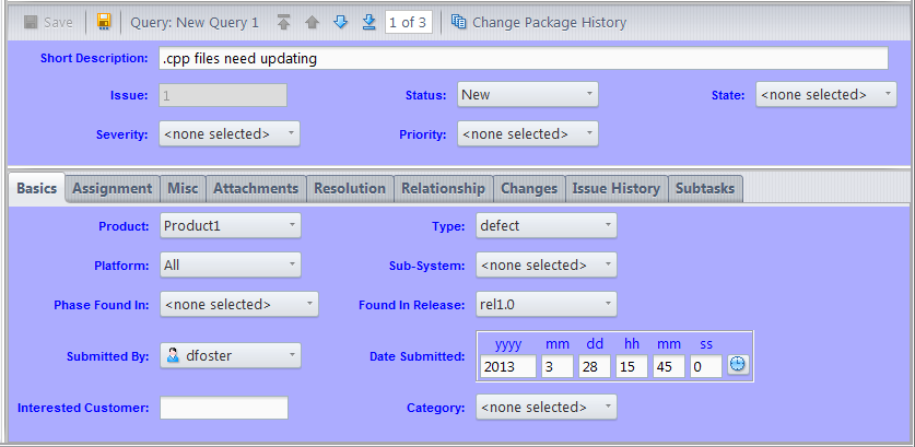The Issue form pane is just like the "full size" Issue form, except that it occupies a pane within the Queries tab, instead of having an entire tab to itself. This pane displays the entire contents of the issue record that's currently selected in the Query Results pane. In addition, browse arrows are enabled in the Issue form pane's toolbar, making it easy to view some or all of the records selected by a query. There is also a Change Package History button (