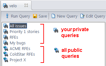 By default, the queries that you create are private queries, which cannot be seen by other users. You can declare any query to be a public query. Such queries are visible to all users, who can use and copy them, but cannot modify your original.
