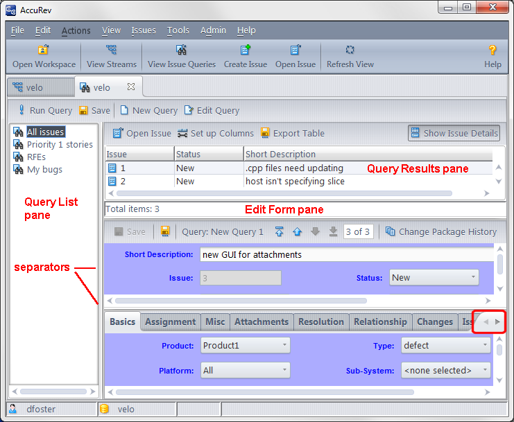 Show Issue Details button in the toolbar of the Query Results pane, an Issue form pane appears below it. This pane is a fully functional Issue form, which you can use to view and modify the issue record currently selected in the Query Results pane. A user preference (Tools > Preferences) configures this pane to appear automatically when you open a Queries tab.