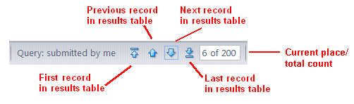 The browse buttons in the Query Issue form pane's toolbar makes it easy to visit all the records in the Query Results pane table.