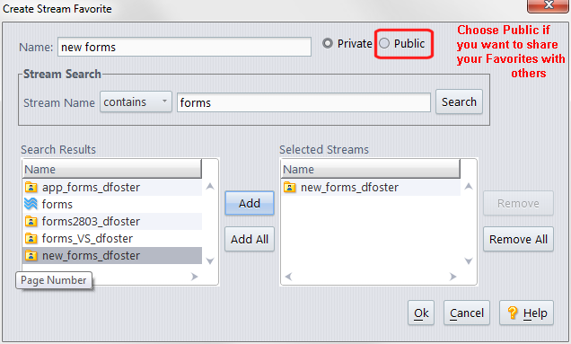 - By default, Stream Favorites are private — that is, the Stream Favorite you create can be used only by you. If you want to be able to share your Stream Favorite with others, click the Public radio button.