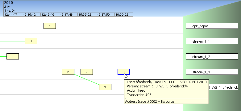 However, if it turns out that the purge was a mistake, you'll need to reverse it. Because AccuRev is TimeSafe, you can’t just make the purge disappear like it never happened. But what you can do is send that version of the file to your workspace (right-click the version in the Version Browser and select Send To Workspace and re-promote it. When the file becomes active in your workspace, it will not have the same version number—in this example it will now be version “3” instead of the original version “2”, and will become version “4” when you perform a Keep on it. After you promote it, the change package in the parent stream will again be complete, and the version browser will no longer show the purged version as a disconnected box.