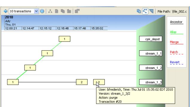 The second, disconnected box for version 2 is the tip-off that the file was purged, and the tooltip message confirms the action.