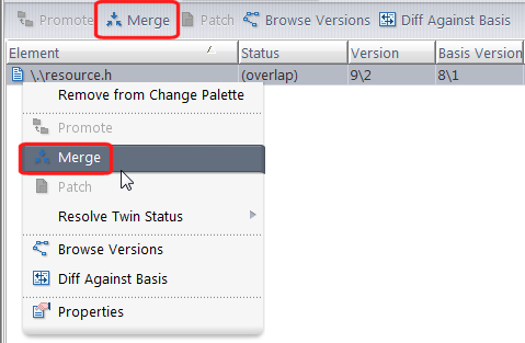 No matter which tool you've configured to merge versions, you invoke the Merge operation in the same way: select one or more files with (overlap) status, then click the