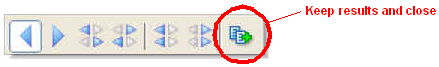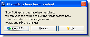 Resumes the Merge session, leaving the Merge tab open so that you can review your choices and changes. You can revise your merge choices and make manual edits. When you're done, click the Keep results and close button on the Merge toolbar: