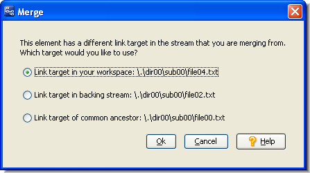 A conflict at the content-level merge is handled by a link-specific dialog: