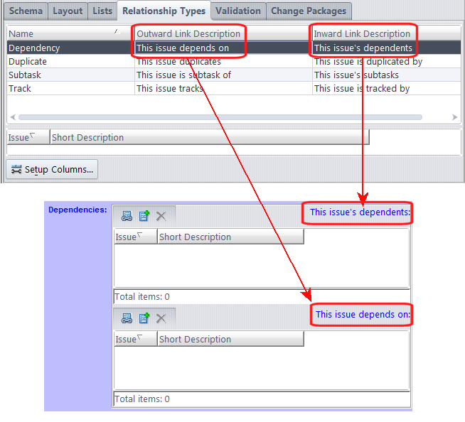 On this subtab, you specify — for each relationship type — which fields from a set of related issue records are to be displayed in a Relationship field.