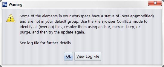 If user preference Update Resolves Trivial Merges is selected, Update determines whether a merge can be performed automatically on all files with (modified)(overlap) status. If so, the update proceeds. If not, the update terminates with an error box: