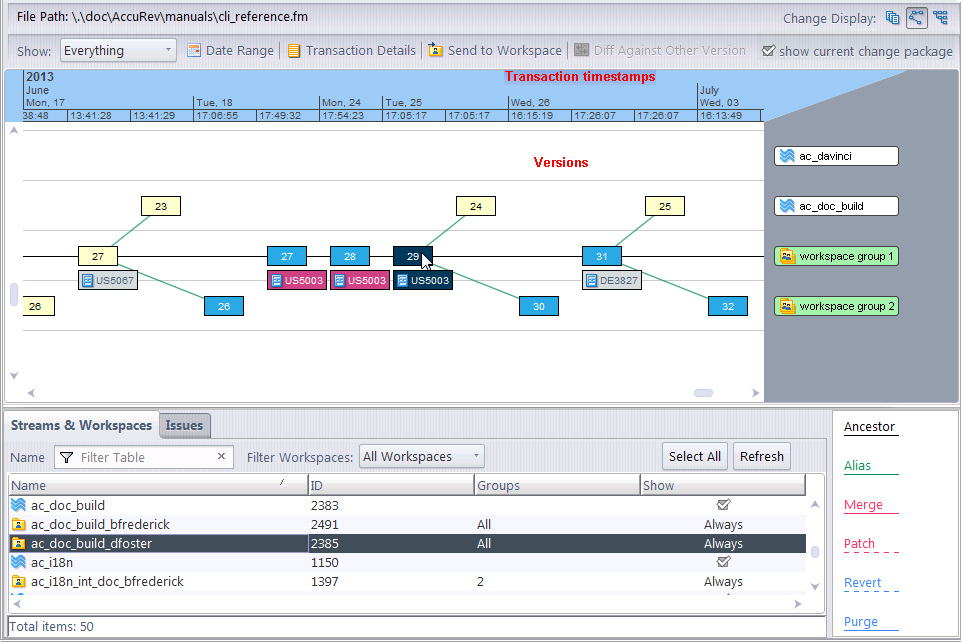 - The right border lists the streams and workspaces where versions reside. White labels indicate dynamic streams; light yellow indicate individual workspaces. Gold labels represent workspace groups, which make the version browser easier to view and navigate. To view the workspaces that belong to workspace group, either mouseover the group, or view individual workspaces in the tabular pane (see below) and examine any entries under the Groups column.