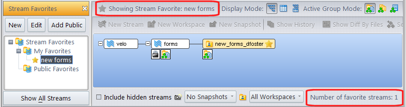 In addition to changing the StreamBrowser display itself, AccuRev shows information about the current Stream Favorite in two places: