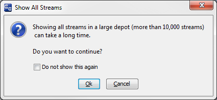 Depending on the size and complexity of your stream hierarchy, showing all streams can take a long time. AccuRev displays an informational message, which gives you the chance to cancel the operation.