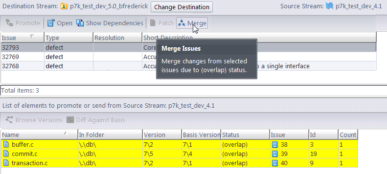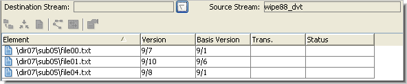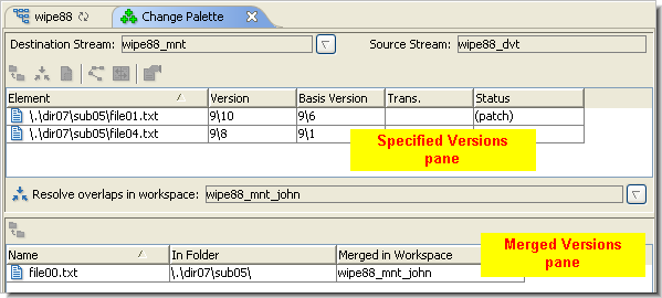 - The Merged Versions pane appears only after you've merged or patched versions in the Specified Versions pane. It lists the versions created by Merge or Patch, and provides a convenient way to promote these versions to the destination stream.