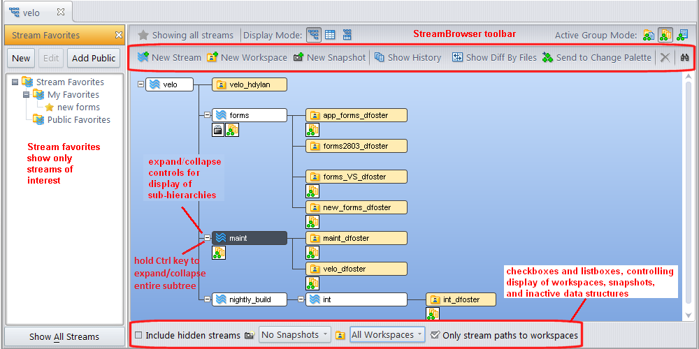 AccuRev's unique StreamBrowser enables graphical control over the entire configuration management environment, in a way that is simple, flexible, and powerful. Using the StreamBrowser, you can view and manipulate all the streams in a depot, including workspace streams and snapshots.