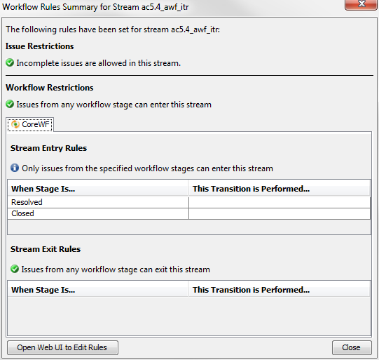 Clicking the workflow icon displays the Workflow Rules Summary dialog box, from which you can review the rules that have been set for that stream. Clicking the Open Web UI to Edit Rules button opens the AccuRev Web UI, from which you can edit existing rules or create new ones