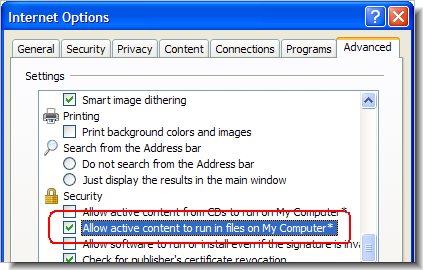 - Scroll down to the Security settings, and ensure that Allow active content to run in files on My Computer is checked.