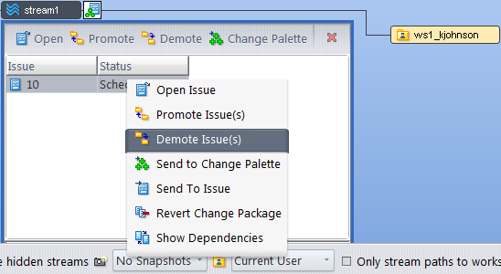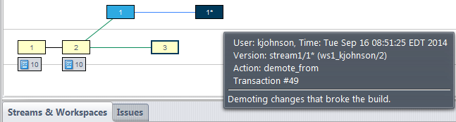 Say, for example, that changes associated with issue 10 introduced a defect that broke your build and you would like to move these changes out of your build stream. You can simply demote issue 10 to a child stream or workspace, fix the defect, and then promote issue 10 back into the parent stream once more.